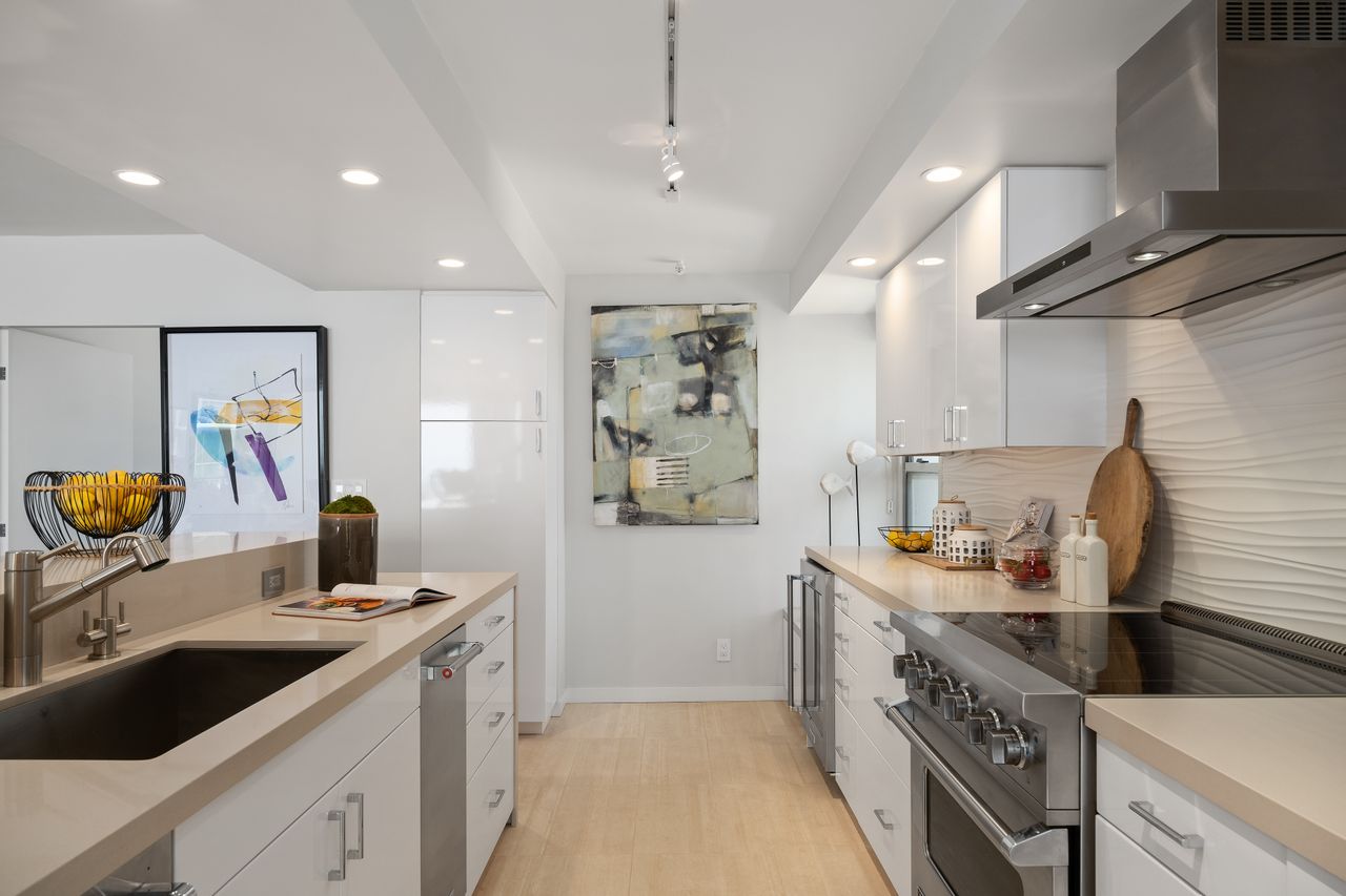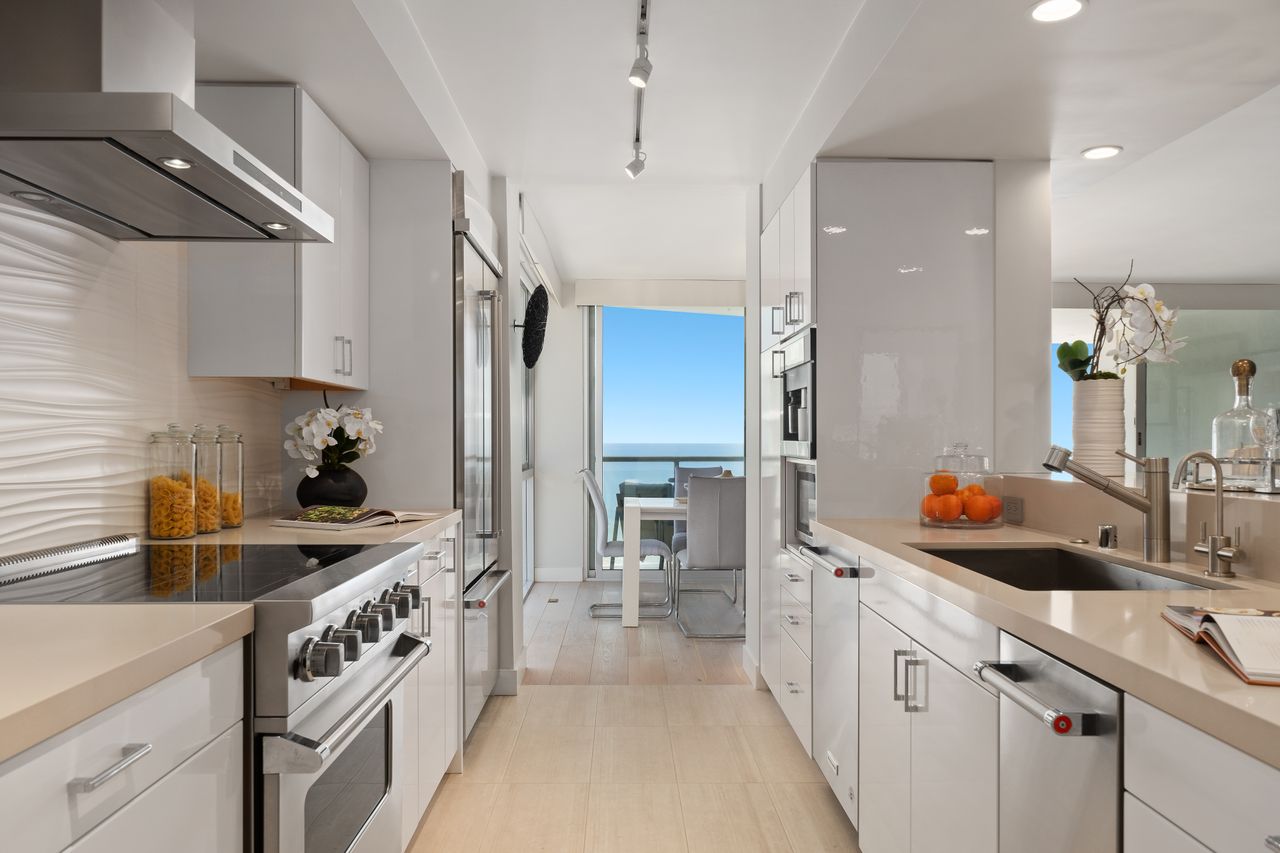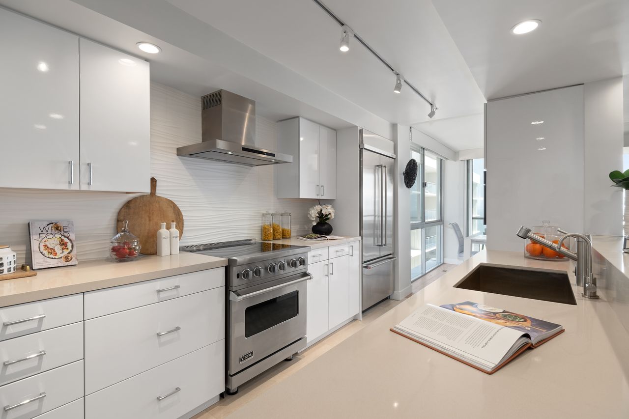 - Stainless Steel Kitchen Appliances With Floor-to-Ceiling Windows