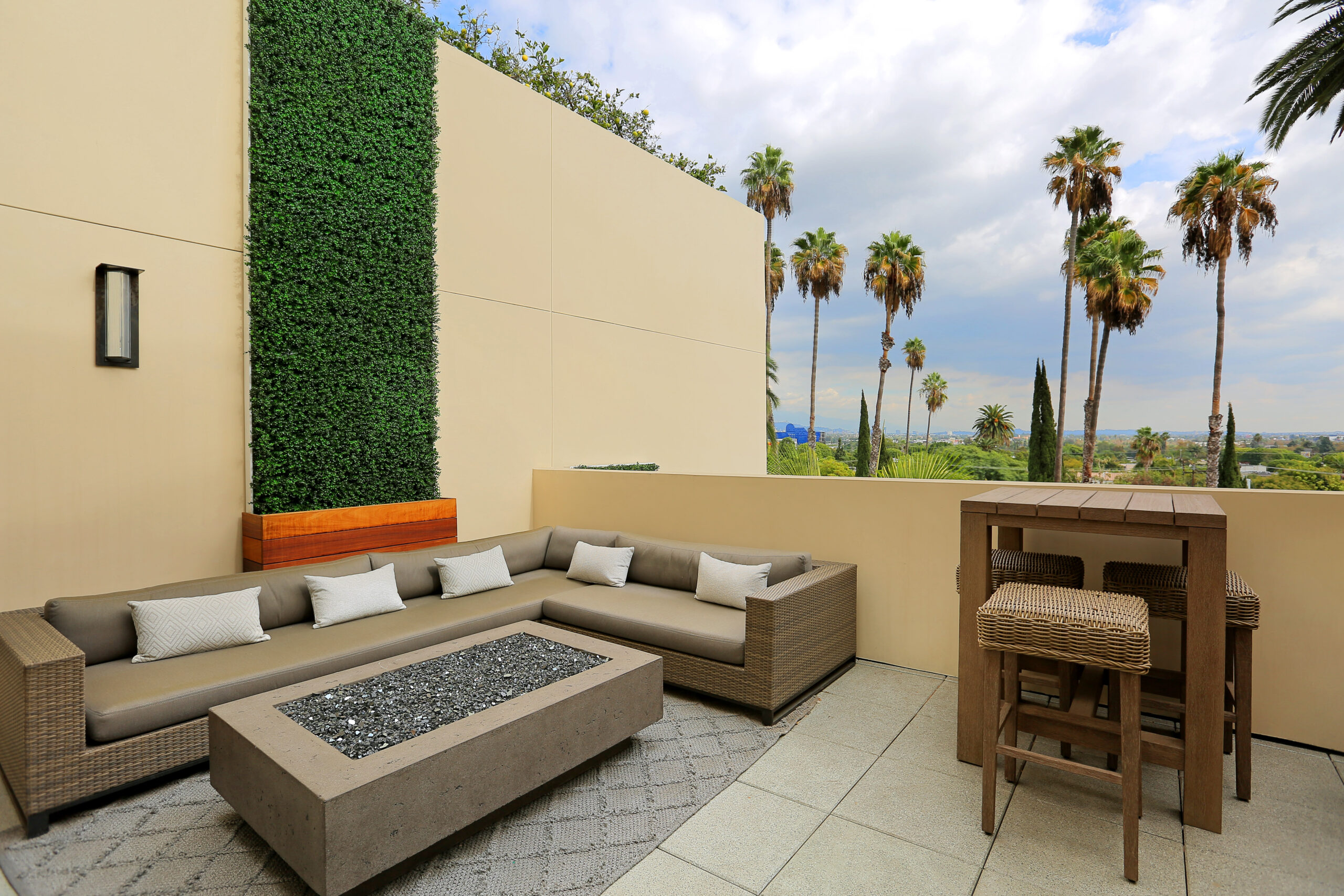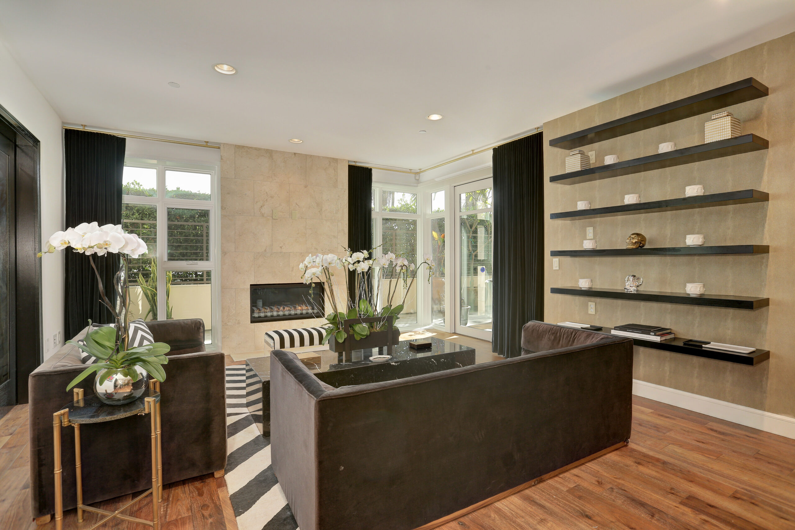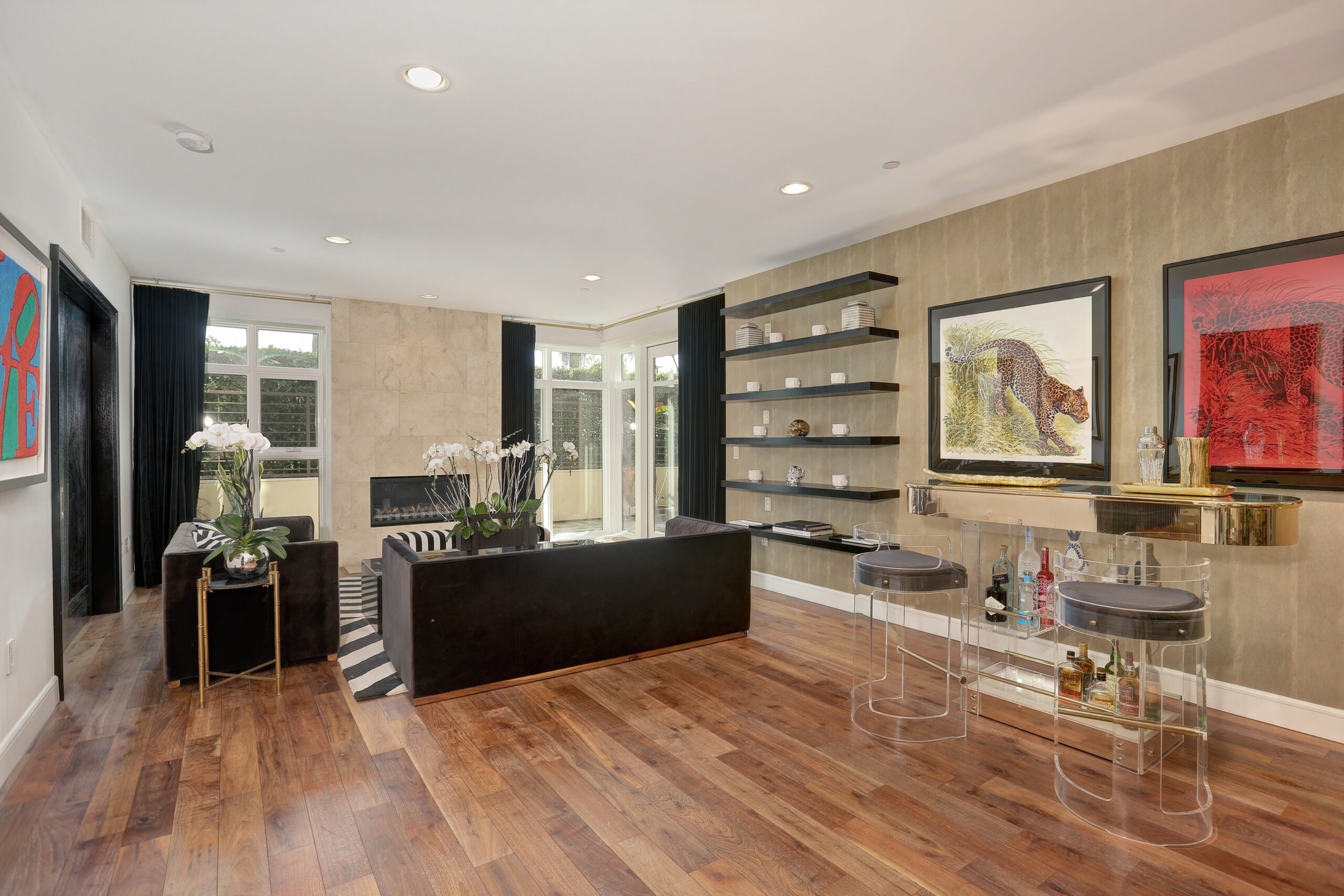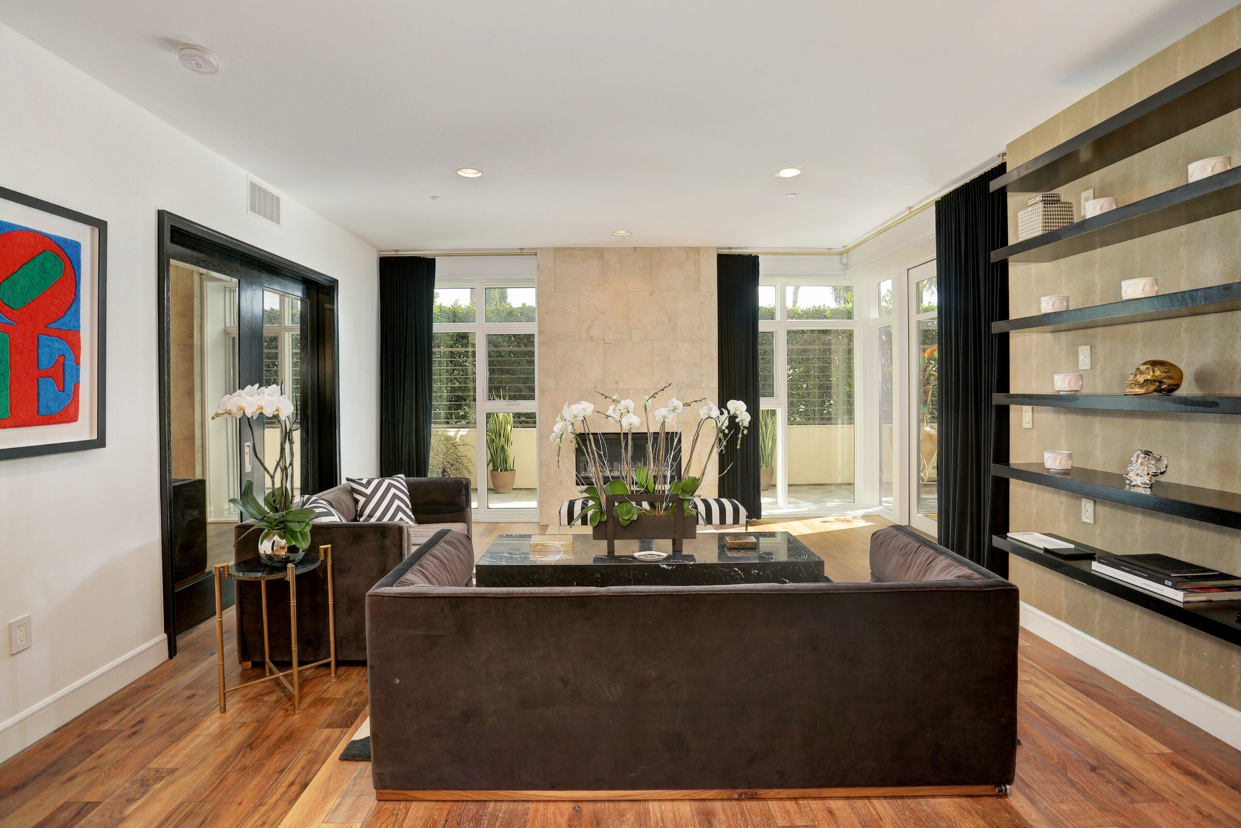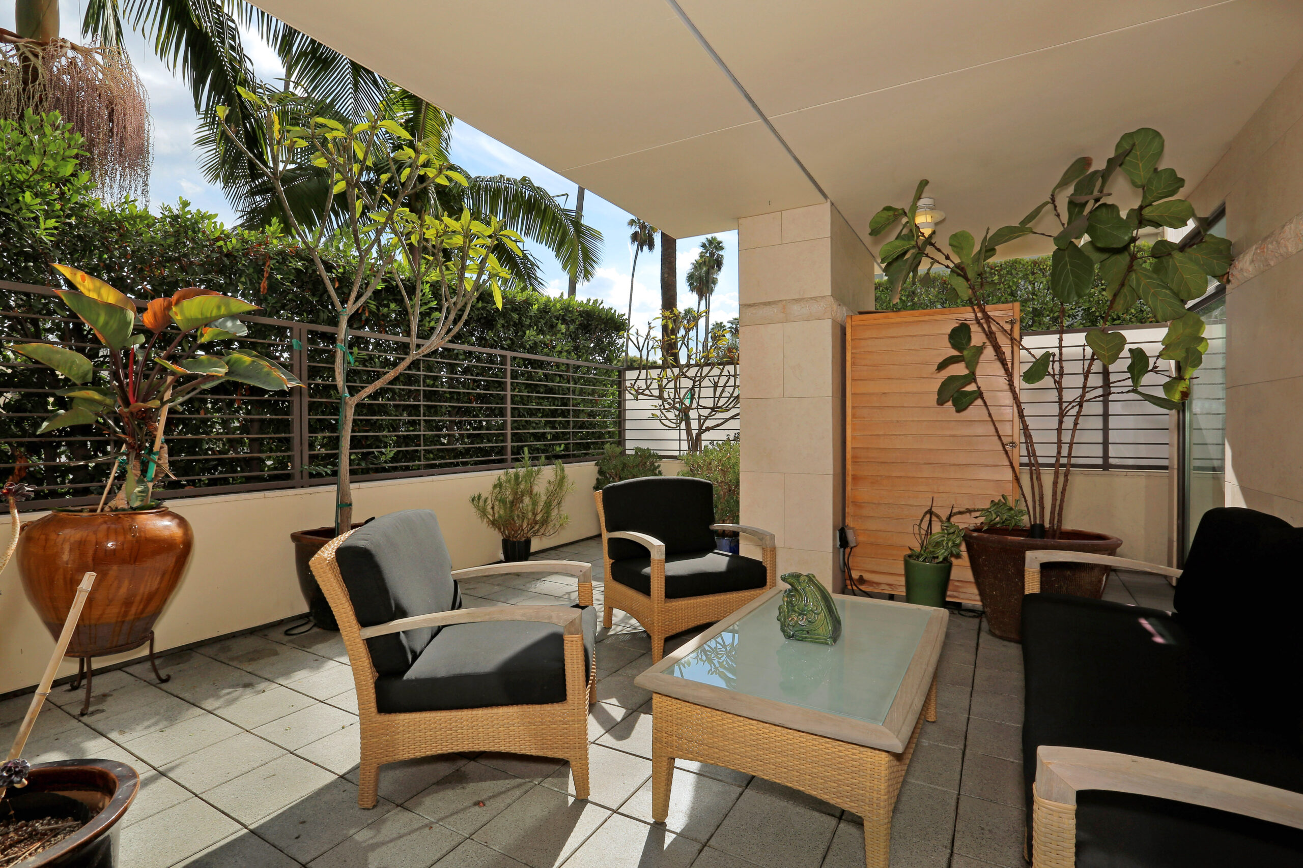 The luxurious condo building in Beverly Hills in one of Beverly Hills newest and finest buildings. Unit #101 conveniently located on the 1st floor with formal entryway and powder room & 2 bedroom suites on opposite sides of the unit. Stunning hardwood floors, this light and bright unit has an open floor plan and a rare and spacious private covered outdoor garden terrace for the unit. Wonderful living room area with gas fireplace, bar area & dining area in the main room. Beautiful gourmet kitchen with stainless steel appliances, granite counters and stunning wood lacquered cabinets. The master suite has a large entry area, two spacious walk in closets, picture windows in the bedroom, sitting area and stunning all marble bathroom with double sinks. The building has wonderful amenities such as an elegant and comfortable lobby with fireplace, 24 hour concierge service, screening media room, modern gym with outdoor lounge area with fountain and a separate 4th floor lounge with gas fire pit area with beautiful views of the palm trees and the city. Private laundry area inside the unit. Two side by side parking spaces and ample guest parking