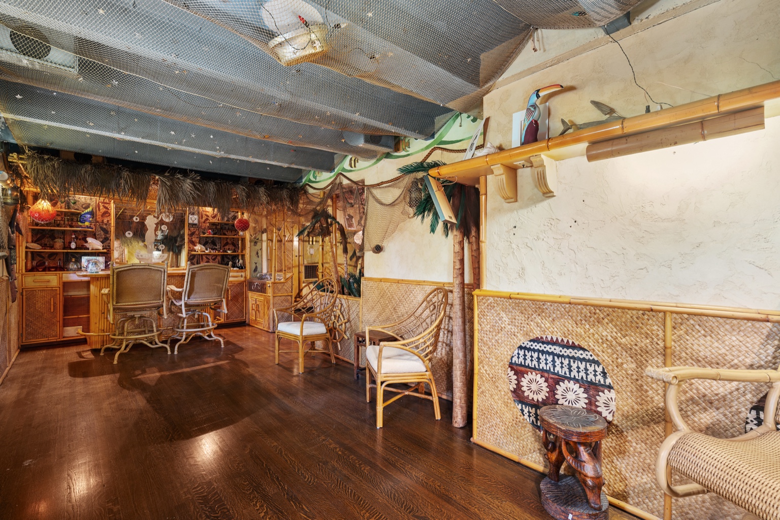 Just beyond the Prohibition Bar, the estate surprises with its vibrant Tiki Lounge, where bamboo canopies, vintage fishnet drapery, and island-inspired furnishings create an immersive tropical escape. This space is a nod to mid-century leisure culture, offering a fun and stylish backdrop for gatherings with friends or family. Imagine sipping a handcrafted cocktail under the palm-fringed ceiling, feeling as if you've stepped into a chic island hideaway without ever leaving Pasadena.
