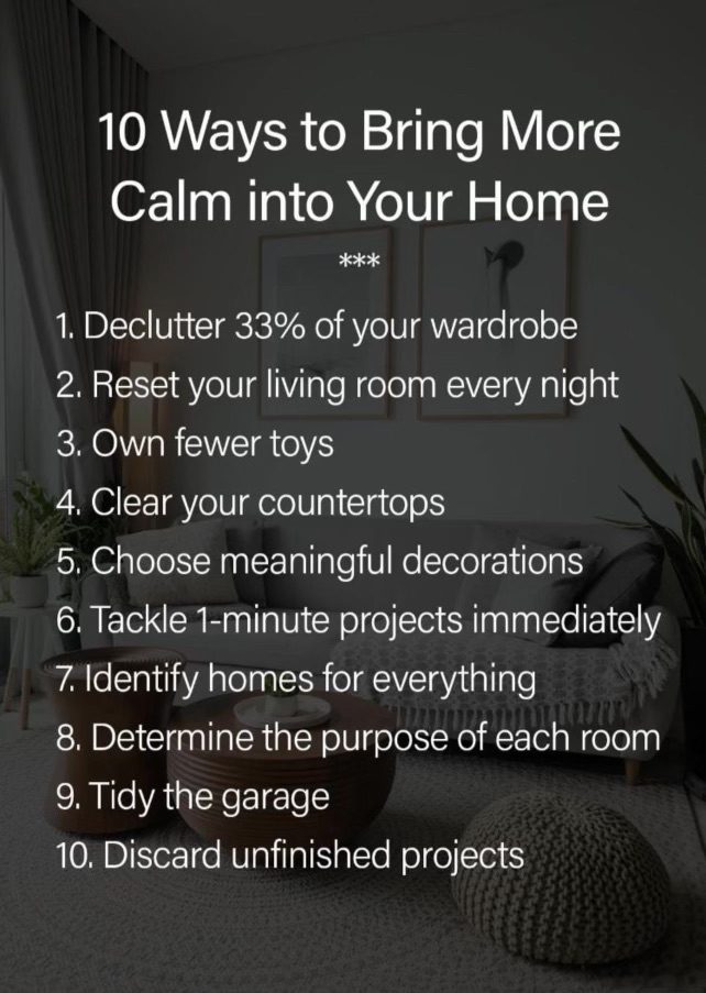 From decluttering a portion of your wardrobe 👔 to resetting your living area nightly, 😴 each tip brings harmony and balance into your home🌿. Dive deep into aesthetic choices by selecting decor that resonates with your soul 🎨. Don't delay those quick tasks – tackle 1-minute projects ASAP ⏱️. Make sure everything has a designated spot and understand the essence of each room in your house 🗄️. And, let's not forget the often-overlooked garage – give it a refresh and discard any lingering unfinished projects 🚗💼.