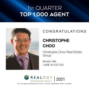 Christophe Choo with Coldwell Banker Global Luxury Real Estate Beverly Hills in the Top 1,000 Agents for the 1st Quarter 2021 for Realogy Brokerage Group.