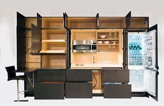 Imagine all the elements of a fully functional kitchen, including a refrigerator, sink, cooktop, oven and dishwasher. Now imagine the entire thing can be instantly concealed and disguised behind a modular cabinet system—no trace of a kitchen to be found.