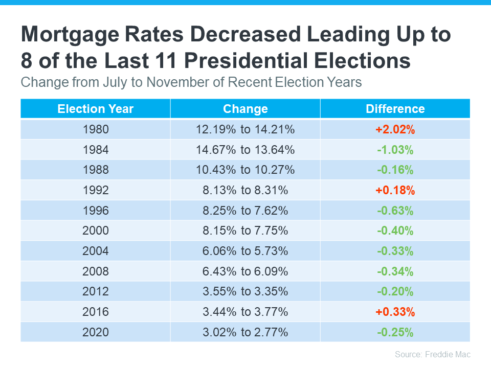 Mortgage rates are crucial because they affect your monthly payments when buying a home. Data from Freddie Mac shows that in eight of the last 11 Presidential election years, mortgage rates decreased from July to November. Most forecasts expect mortgage rates to ease slightly throughout the remainder of the year, following the trend of declining rates leading up to most previous elections. Lower rates could mean lower monthly payments, making it a potentially good time to buy a home.