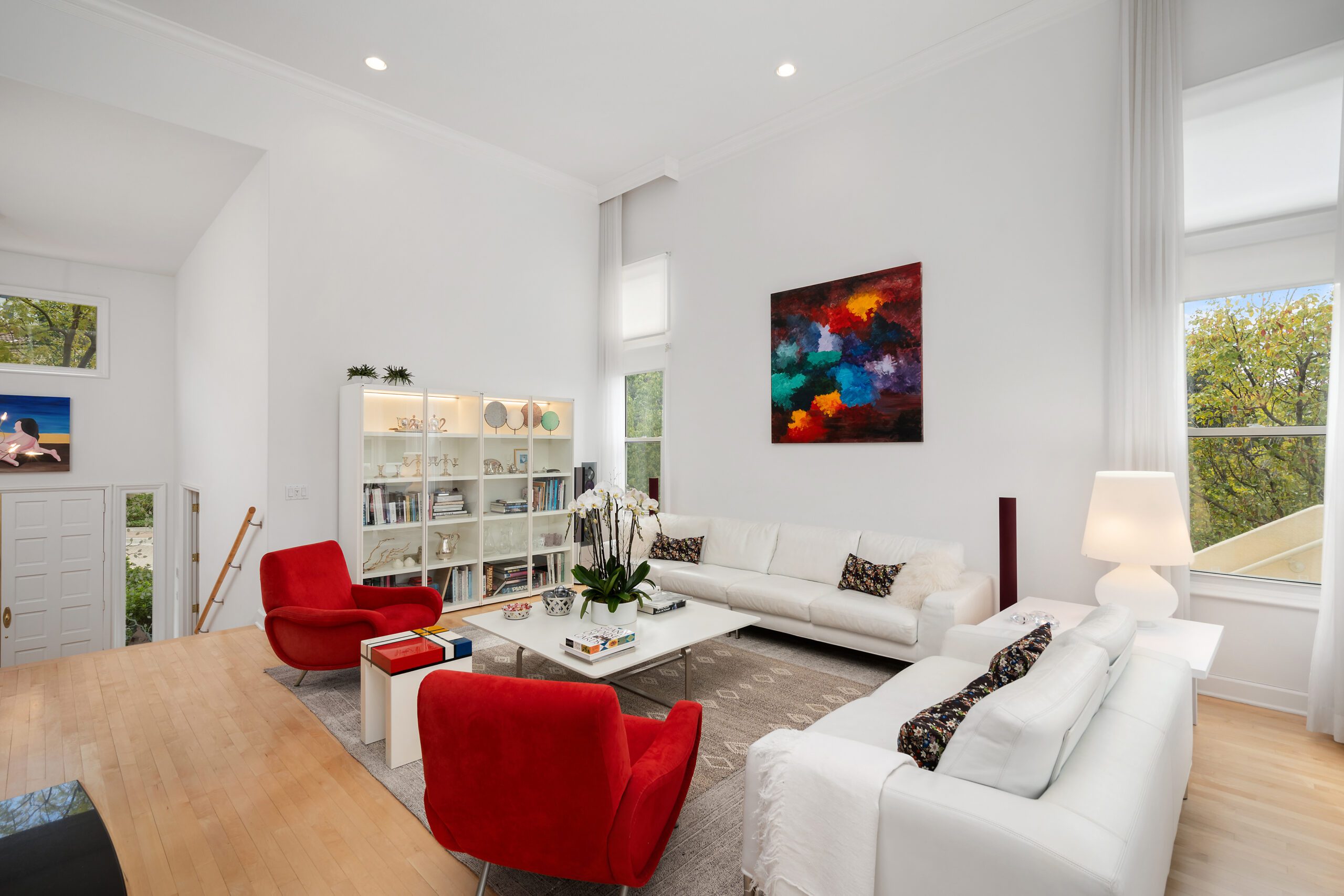 Elevate your living with sky-high ceilings that invite an abundance of natural light to dance across the room! 🔆🏠 This cozy corner, with its crackling fireplace 🔥, is your perfect retreat for serene evenings. And just beyond those generous windows, the lush views offer a tranquil backdrop that's simply priceless. 🌳💖 Whether it's the vibrant pop of the red accent chair or the elegant simplicity of the space, every detail here speaks to a life well-lived.