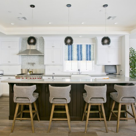 Talk about breezy summer energy: the state-of-the-art kitchen of this 5-bedroom Cape Cod style home in Manhattan Beach gives off that summery vibe with vaulted ceilings, Provenza wide plank hardwood, Carrera marble and Jeldwyn windows — which are covered in a bright New England stripes-meets-tie dye-inspired way.