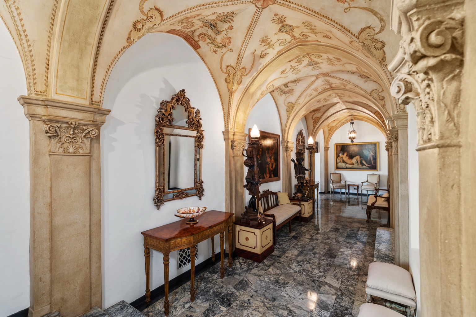 The wood-paneled library showcases some of the estate’s most exquisite period details—from hand-carved Corinthian columns to a detailed fireplace flanked by bookshelves. It’s a room that evokes both prestige and warmth—a perfect retreat for work or quiet reflection.