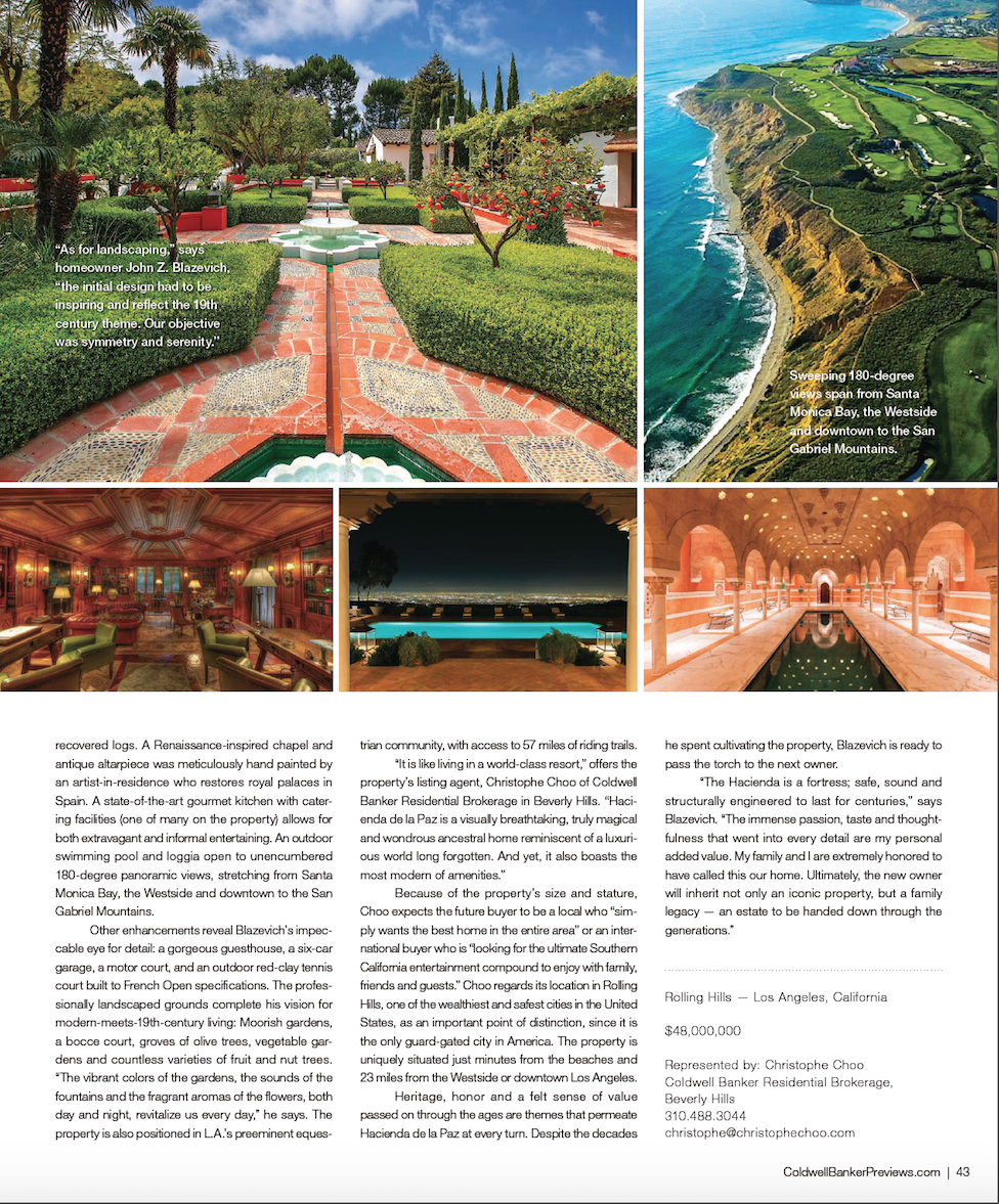Our amazing listing of Hacienda de la Paz listed at $48 million in the city of Rolling Hills in Los Angeles is the California Spotlight featured on pages 42-43