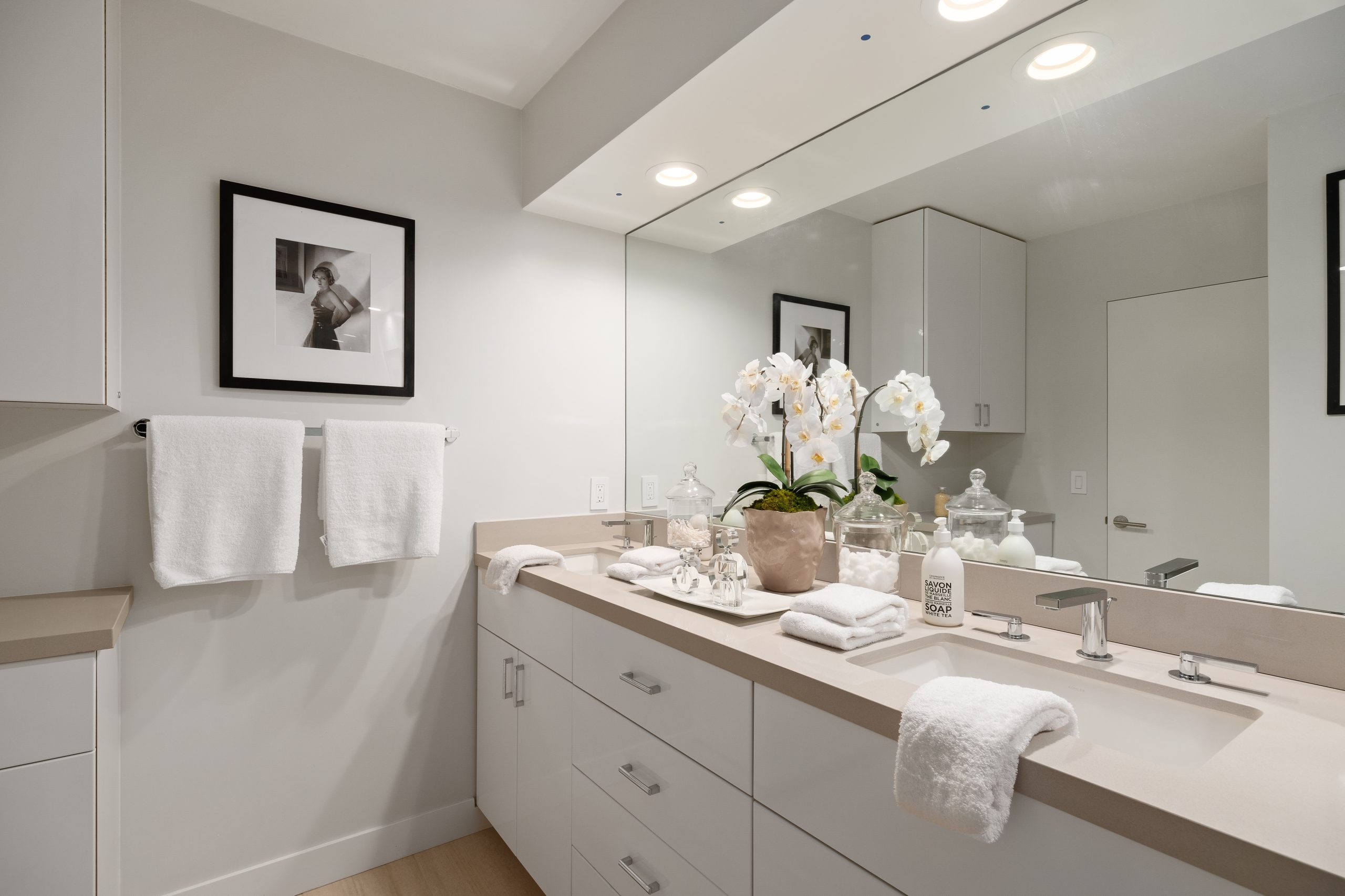 A spacious primary suite with dual vanities, walk-in closet, and expansive city-to-mountain views