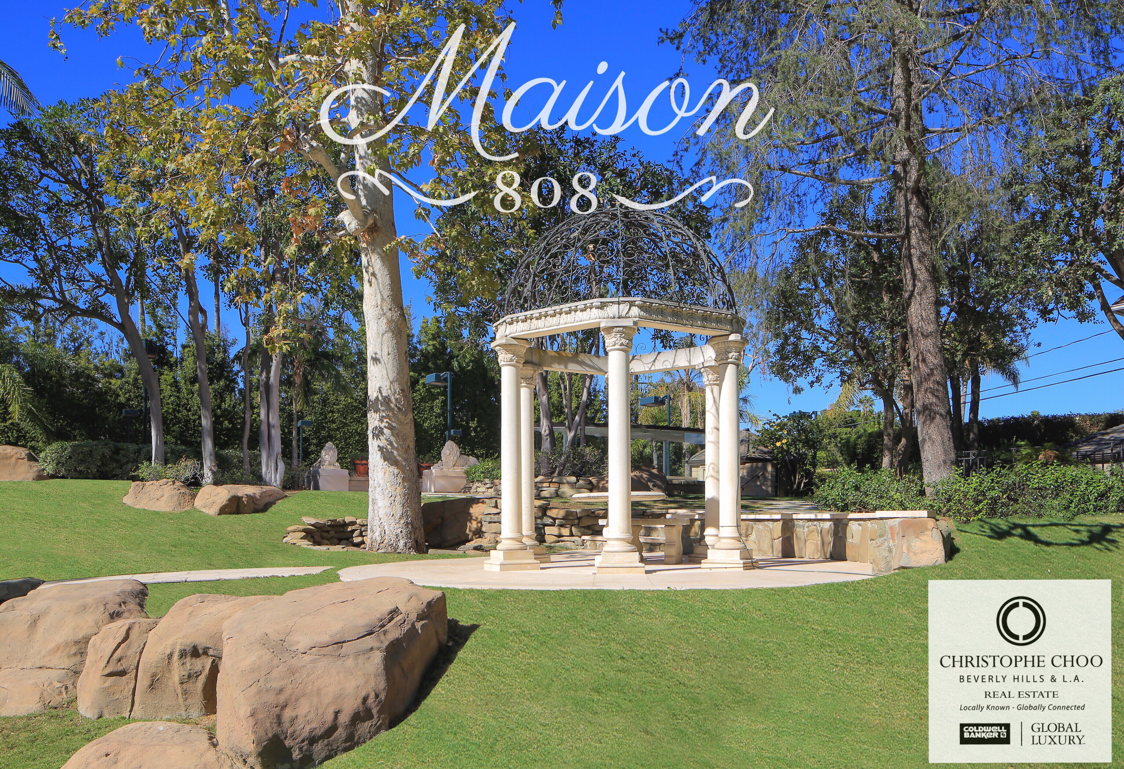 Maison 808 in Beverly Hills on 1.68 acres of mature trees, manicured flat lawns and meandering walkways with a romantic gazebo.
