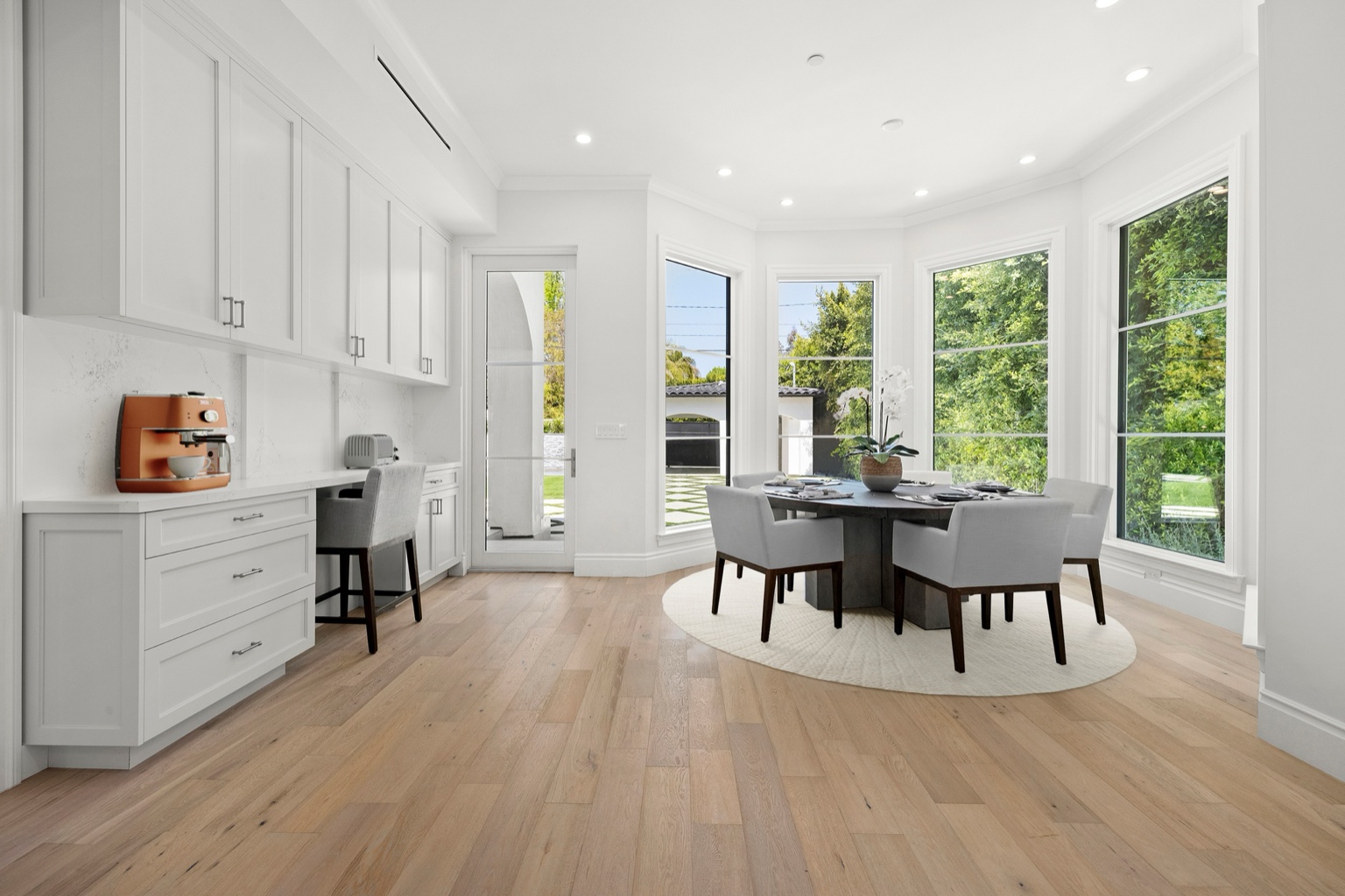 Imagine beginning your morning with a cup of espresso at your built-in home workstation, bathed in soft natural light from oversized picture windows framing the lush gardens outside. While the sunlight pours in, your children gather at the cozy breakfast table — set within a graceful bay of windows — to enjoy a warm meal before school, surrounded by the serenity of manicured greenery.