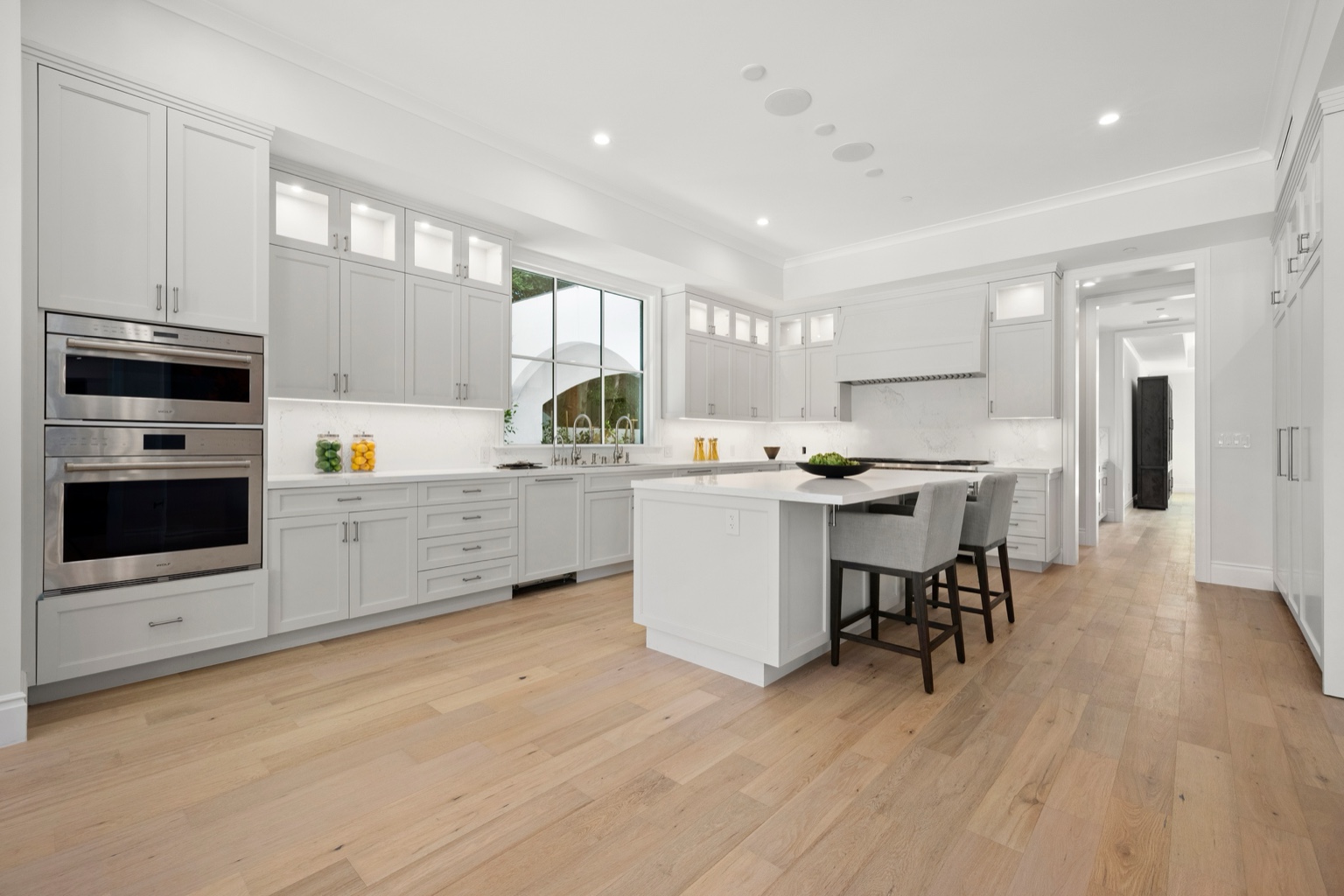 White quartz countertops, custom soft-close cabinetry, and a massive center island offer ample space for meal prep and informal dining. Thoughtful built-ins — from appliance garages to a dedicated workstation — make this more than just a kitchen; it’s a multifunctional space that supports everything from morning routines to elegant entertaining.