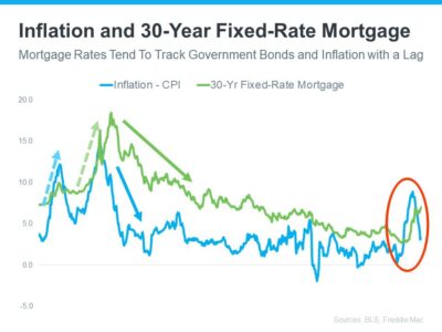The circled portion of the graph underscores the most recent inflation surge, with mortgage rates closely trailing behind. As inflation has moderated somewhat in the current year, mortgage rates have not yet mirrored a similar decrease.