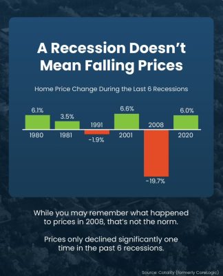 In all the other five recessions, home values either remained stable or appreciated—with increases ranging from 3.5% to 6.6%. That means historically, real estate has remained a strong, stable investment during economic downturns.