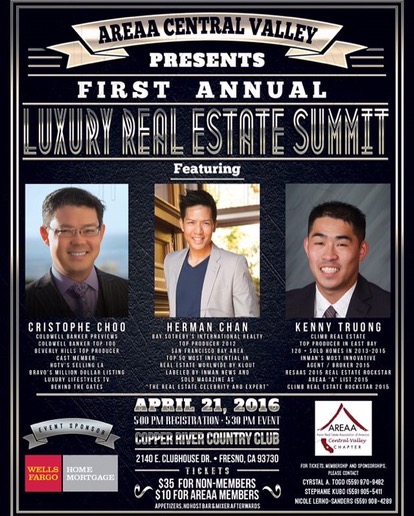 I am thrilled to be one of the speakers at AREAA Central Valley’s First Annual Luxury Real Estate Summit on April 21st 2016 at the Copper River Country Club in Fresno with Herman Chan & Kenny Truong. If you are a Realtor in the Central Valley area make sure to attend this amazing event.