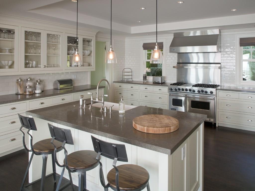 U-shape layouts don’t work very well in large kitchens: The walking distance from one side of the layout to the other is too great. To solve that problem, add a center island. The island not only shortens the distance, it also increases storage and countertop space and provides a spot to install a second sink, cooktop, oven or range.