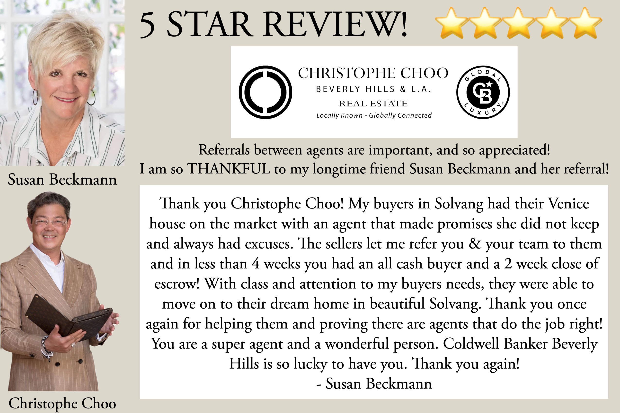 Susan Beckmann Agent Referral 5 Star Review | Christophe Choo at Coldwell Banker Global Luxury is Your Local Real Estate Expert
