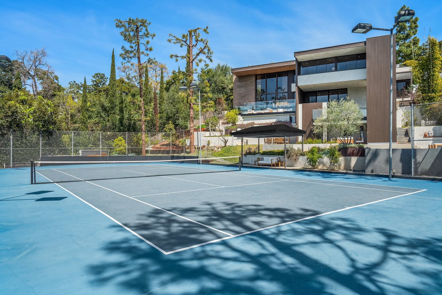 At 1005 Elden Way, the court is beautifully framed by tall hedges, mature trees, and elegant outdoor living spaces. An adjacent pavilion offers shaded seating for spectators or guests, creating an atmosphere more akin to a private tennis club than a private home.