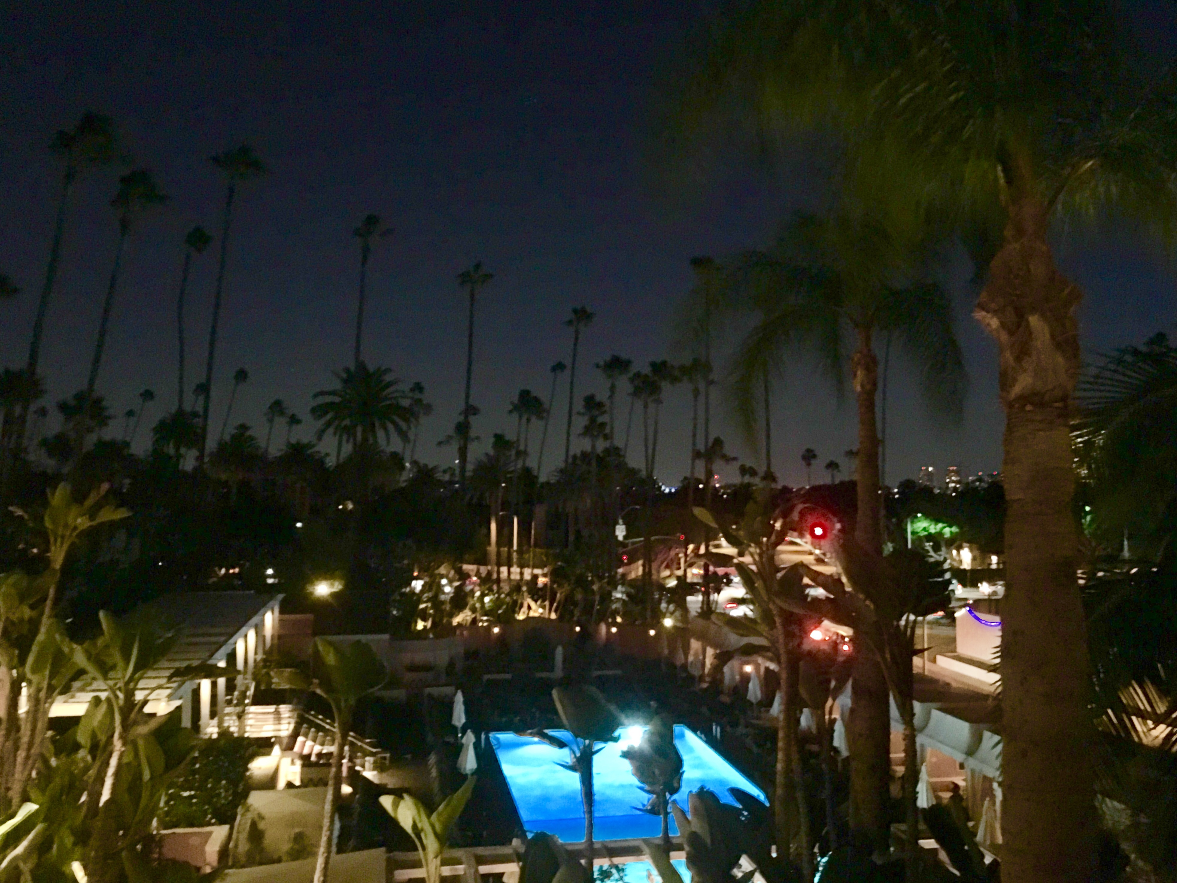 The beautiful evening view, poolside at the world famous Beverly Hills hotel on Sunset Boulevard with signature Beverly Hills palm trees all around #BeverlyHills #palmtrees #beverlyhillshotel