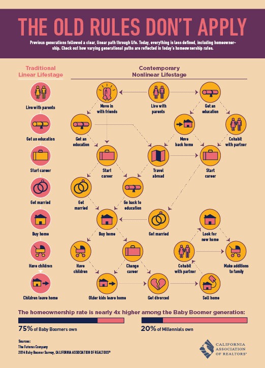 Previous generations followed a clear, linear path through life. Today, everything is less defined, including homeowner-ship. Check out this infographic on how varying generational paths are reflecting in today's homeownership rates.
