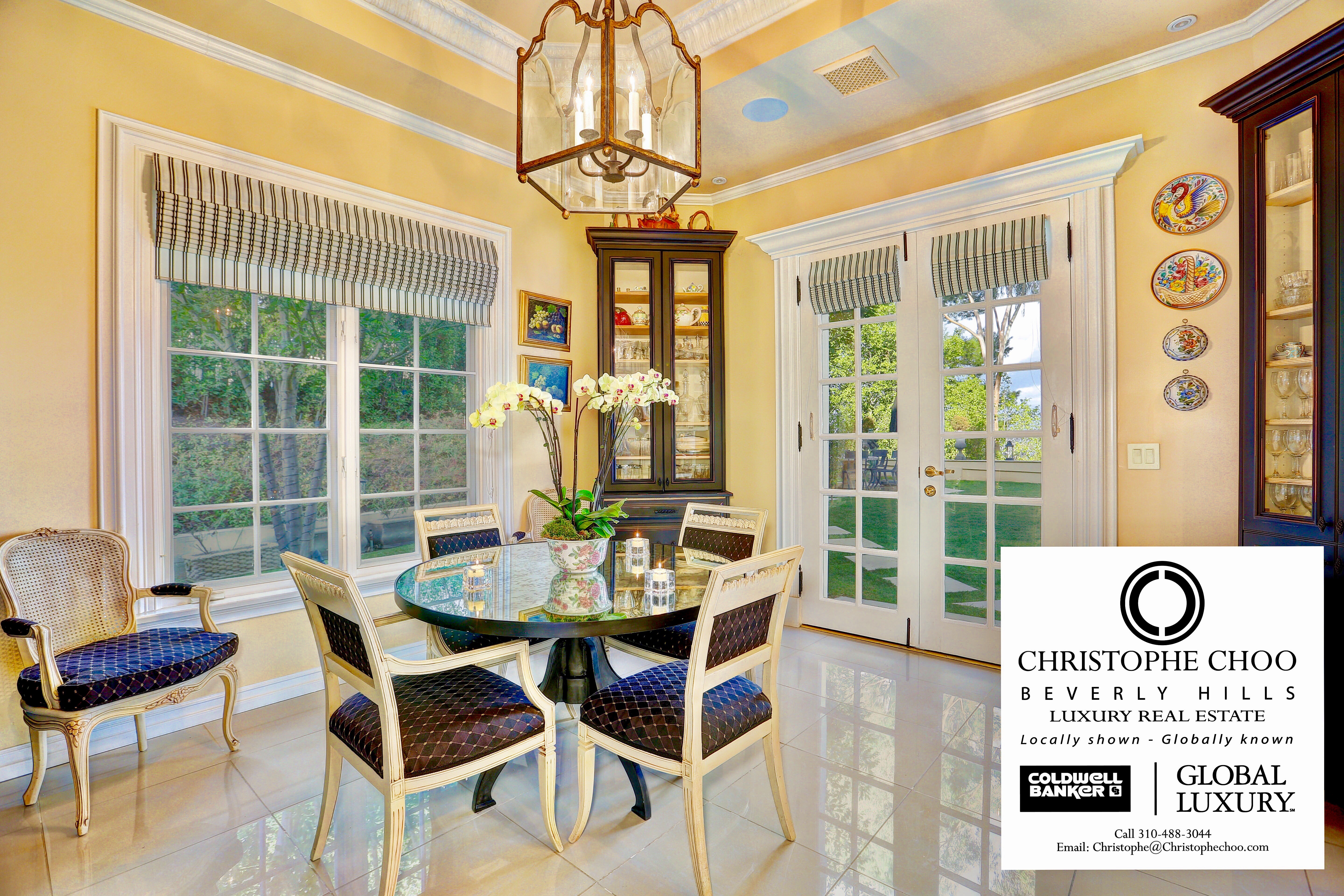 The perfect spot for breakfast or casual dining overlooking the garden and pool at The Summit Villa in Beverly Hills listed at $6,888,000