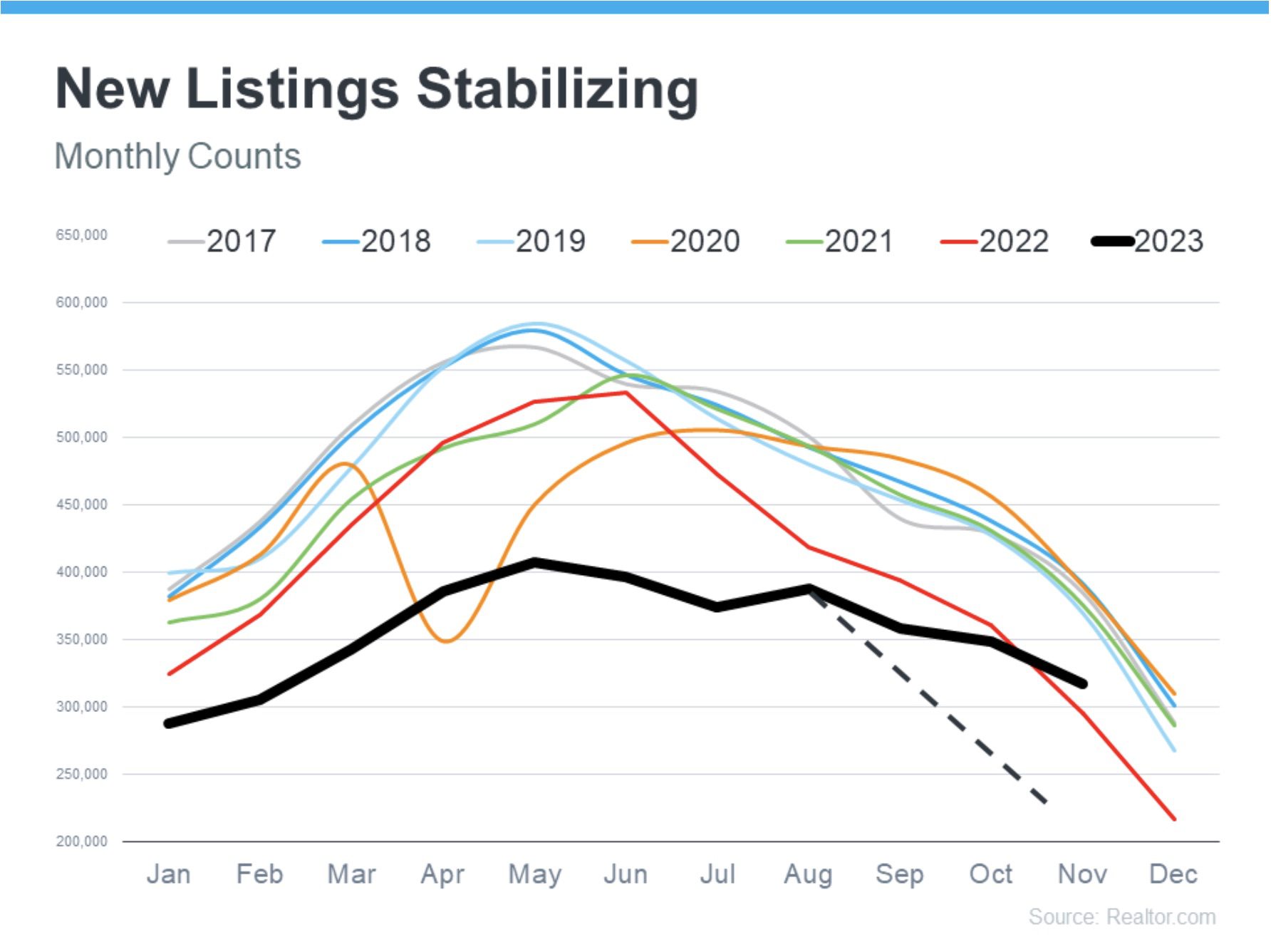 Data from Realtor.com shows that from 2017-2019, the Los Angeles and Beverly Hills markets followed typical seasonal trends. However, starting in 2020, these patterns were disrupted due to the pandemic. What's intriguing about 2023 is that, unlike previous years, the expected decrease in new listings hasn’t occurred. Instead, there's a stabilization in new listings, with even more homes coming onto the market compared to last year.